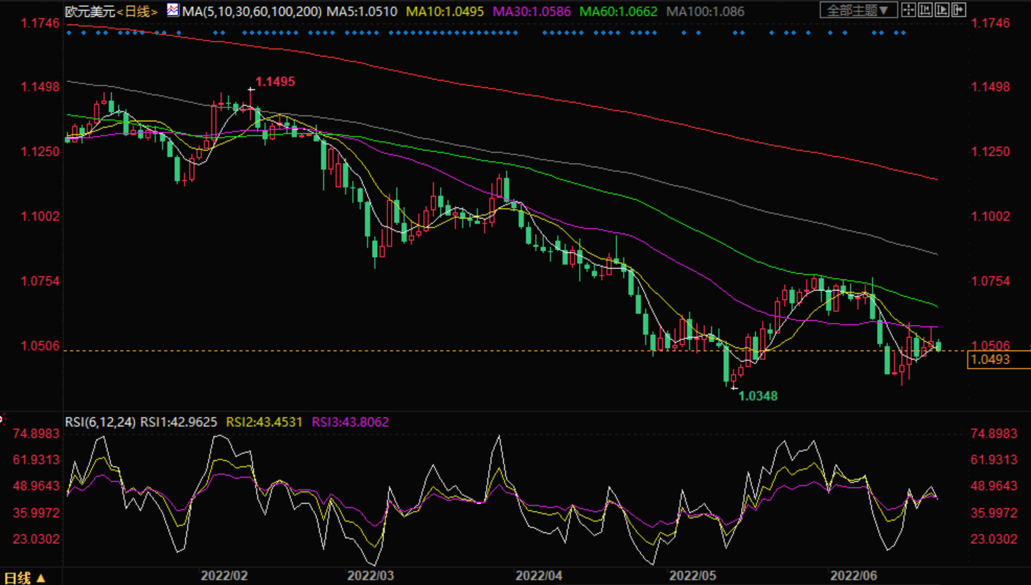 美元指数:截止发稿,美元指数小幅上涨,现报104.75,涨幅0.32%。欧市盘前,美元指数在104.65附近刷新盘中高点,为三日来首日上升。美元指标的最新走势与前一天悲观的美国数据有一定的关系。美国成屋销售年率跌至两年最低水平。此外5月芝加哥联储全国活动指数也下降至0.01,前值下修至0.04。最重要的是,美联储主席鲍威尔是否有能力证明这次自1994年以来最大规模的加息是合理的。在过去的四个月里,美联储已经将利率提高到了1.50-1.75%,但是对通货膨胀的影响仍然不明显。这支撑了美元指数,美元指数正试图维持在周二的高点104.60上方。