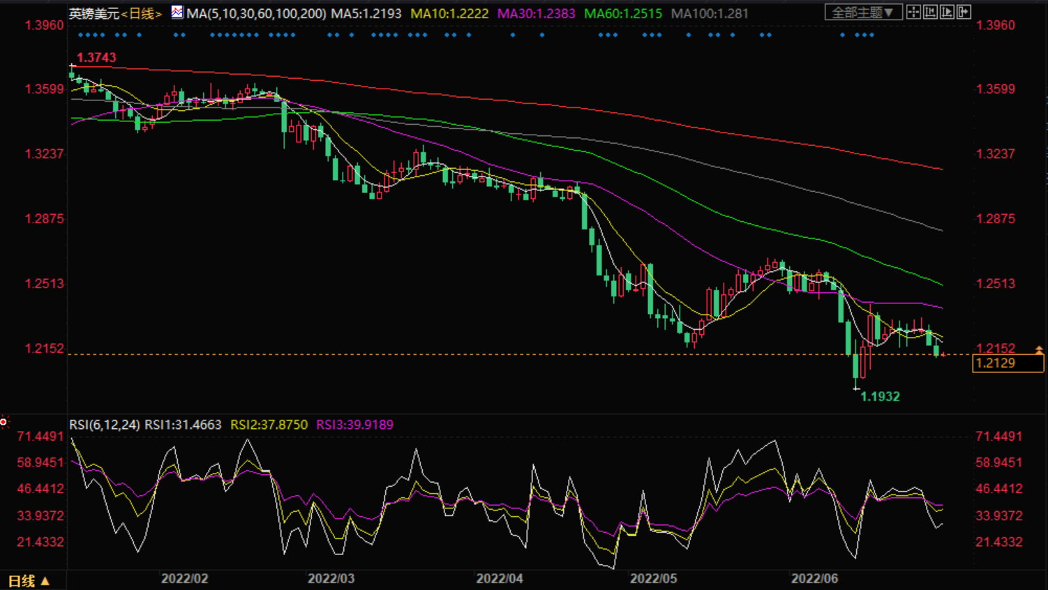 英镑昨日震荡下行,刷新9日低位,现汇价交投于1.2120附近。除美元指数在多重利好因素的支撑下突破105.00关口是施压英镑走软的主要原因外,对英国经济增长的担忧也持续对英镑构成打压。此外,时段内英国央行行长贝利发表的鸽派言论也对汇价构成了一定的打压。今日关注1.2200附近的压力情况,下方支撑在1.2050附近。