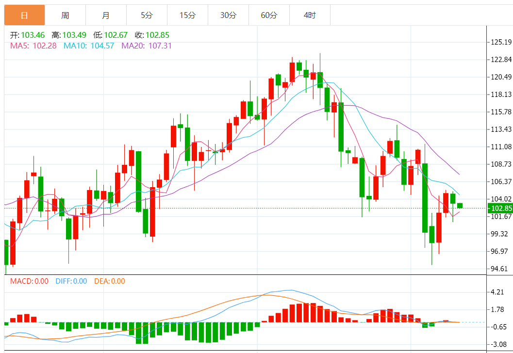 技术上,鉴于相对低位类似“吞没”看涨K线组合和KDJ轻微金叉,失守5日均线前,多头仍留有机会。上方10日均线阻力目前在105.46附近,100日均线阻力在107.24附近,55日均线阻力在109.56附近,若油价能够顶破该阻力,则增加后市看涨信号。