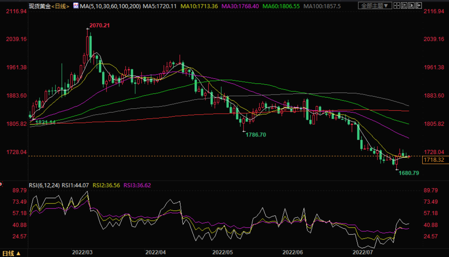 周三(7月27日)亚市盘初,现货黄金窄幅震荡,目前交投于1719.30美元/盎司,全球经济衰退预期、地缘局势紧张、美债收益率下降,给金价提供了一些支撑,但美元守住布林线中轨后反弹,令金价承压。目前投资者预计美联储主席鲍威尔可能为9月份加息50个基点或者75个基点做好铺垫,金价短线仍有进一步下行风险,但投资者还需留意美联储对经济衰退的观点和态度,如果多次提交经济衰退,则有望给金价提供探底回升的机会。