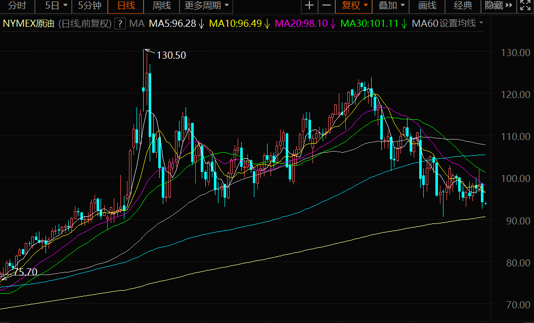 技术上,初步阻力参考21日均线99.29附近,然后是100整数关口,进一步阻力在上周五高点101.86附近,也可以参考布林线中轨101.19附近阻力,若能顶破该阻力,则增加短线看涨信号;进一步阻力在7月19日高点104.43附近和100日均线106.25附近。不过,鉴于上周五油价冲高回落,受到布林线中轨压制非常明显,下行趋势线压制也依然存在,投资者仍需密切提防油价重回跌势的风险。
