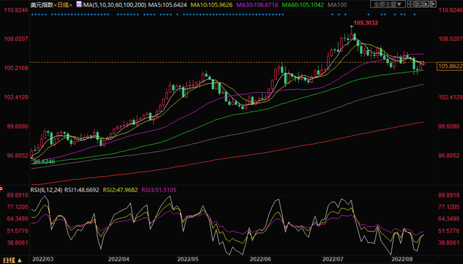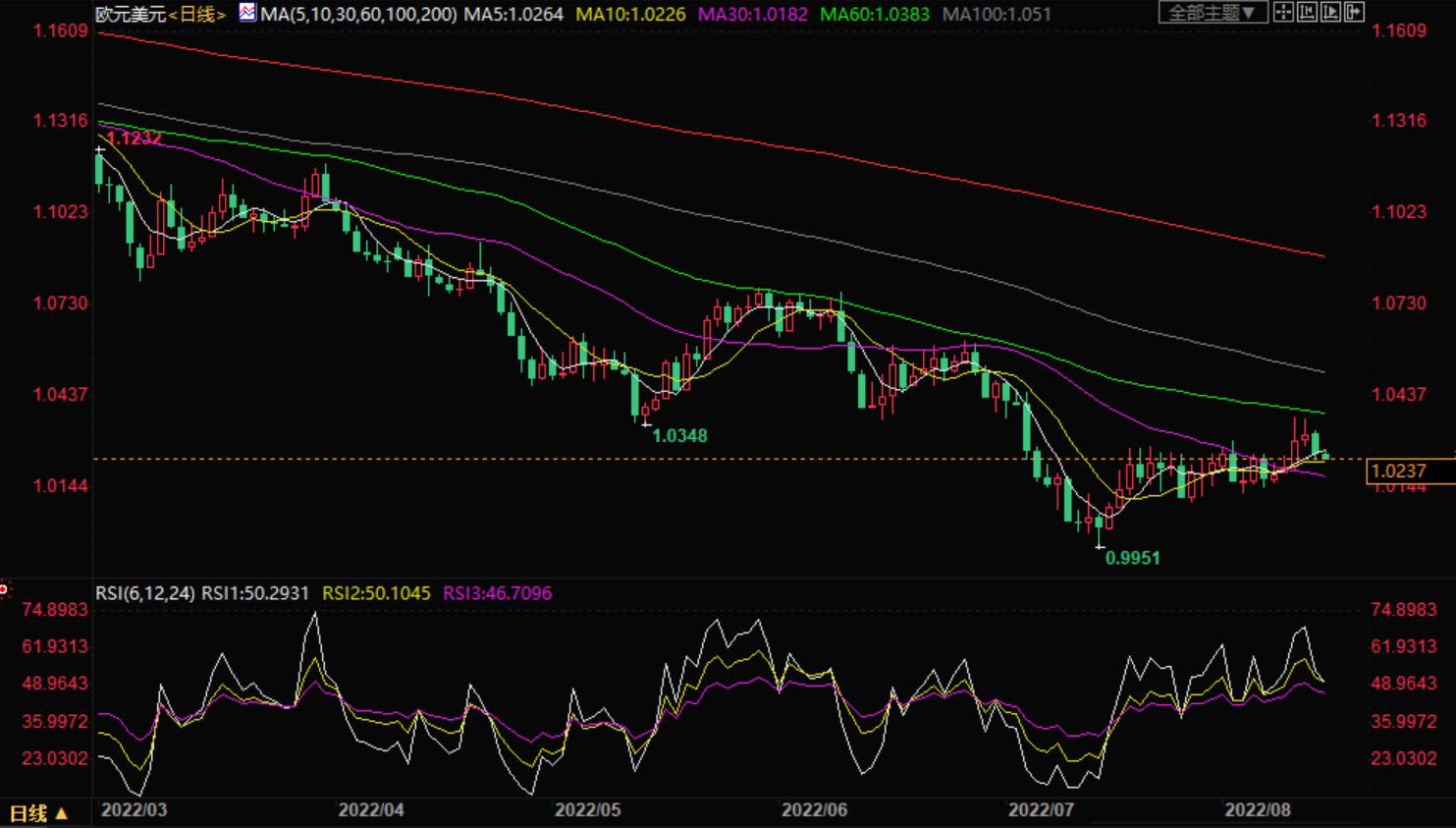美元指数:截止发稿,美元指数窄幅震荡,现报105.85,涨幅0.16%。欧市盘前,美元指数徘徊于105.75附近。让美元走强的另一个原因是,美联储政策制定者拒绝称赞近期通胀走软,以及中国和欧洲对经济的担忧。美元多头跌破美债收益率周线反弹。由于市场预期美联储在通胀疲软的情况下收紧政策幅度将回落,上周未资金流提振美元继上周大跌后出现反弹。