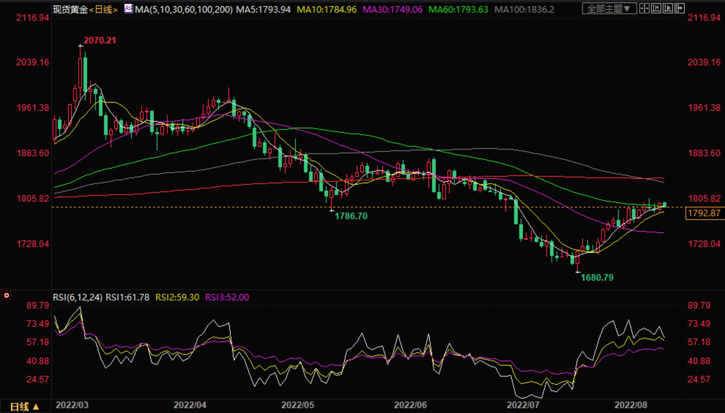 技术面:金价录得一周多以来最大单日跌幅,自6-7月跌势的61.8%斐波回档位反转。不过RSI回撤也支持黄金近期下跌。200SMA和38.2%斐波回档位在1754美元附近重合,似乎对空头构成强劲障碍。