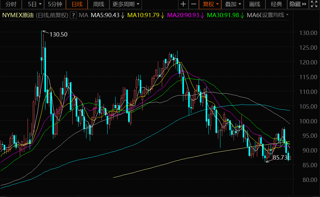 技术上,由于MACD金叉信号仍在,近两个交易日油价跌幅较大,在跌破85.71前,油价仍留有探底回升或者低位震荡调整的可能性,上方初步阻力在90关口附近21日均线阻力在90.93附近,10日均线阻力在92.22附近,若能收复该位置,则削弱短线看空信号。