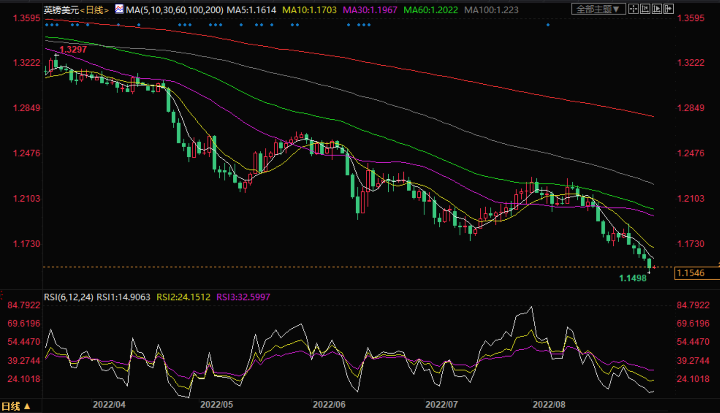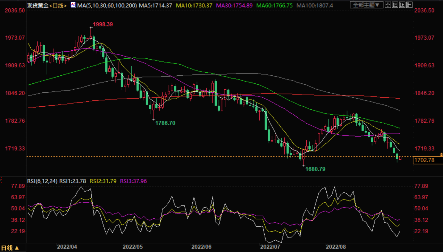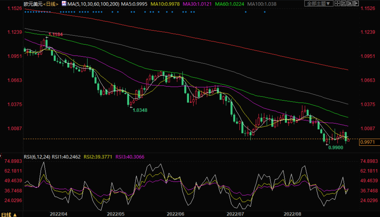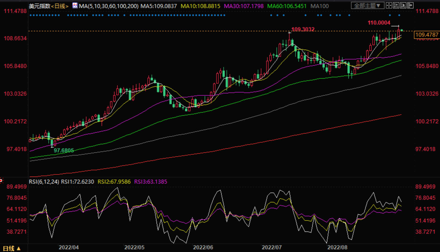 美元指数:截止发稿,美元指数下跌,现报109.46,跌幅0.17%。欧市盘前,美元指数盘中下跌0.13%,至109.52,同时从2002年以来的最高水平回落。由于对美国8月份非农就业人数和失业率的悲观预测,美元指标有所回落,预期分别为30万和3.5%,而前值分别为528K和3.5%。
