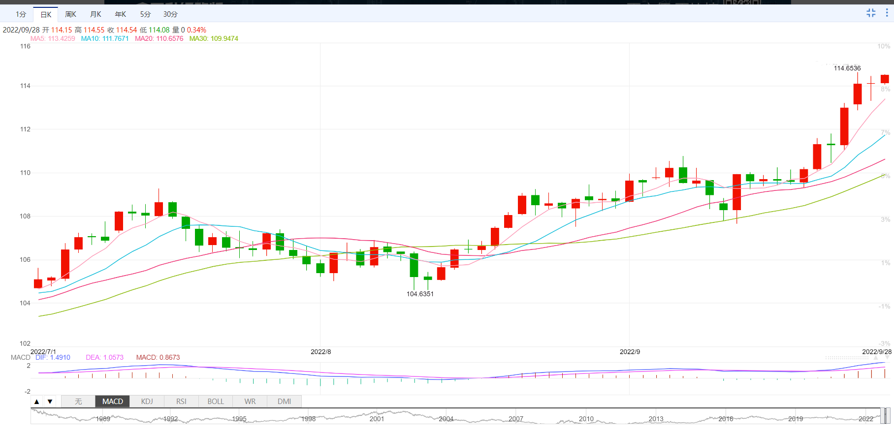 周三早盘,美元指数交投于114.54附近;美元周二在震荡交投中没取得什么进展,盘中拉锯,从20年来的最强水平回落,尽管在美联储决策者谈论进一步加息的情况下,对风险较高资产的胃纳仍然很弱,金价从两年半低位反弹,但迫在眉睫的加息风险依然存在;油价从九个月低点回升超2%,受益于飓风伊恩到来之前美国墨西哥湾的供应受限。英镑兑美元纽约尾盘上涨0.3%,盘中稍早攀升超过1%至1.0837美元。英镑在周一曾跌至历史最低。欧元兑美元下跌0.20%,报0.96美元;美元兑日元报144.86,上涨0.1%。美国股市日内走势也震荡,对汇市并没有什么帮助。