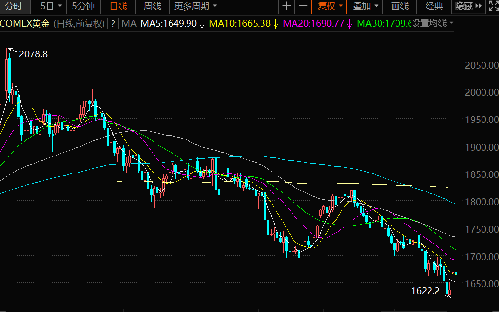 周四亚盘,现货黄金徘徊于1654附近。金价周三上涨约2%,美元回落让黄金的避险吸引力有所增强,但大幅加息的前景让无收益黄金的价格仍保持在两年半低位附近。