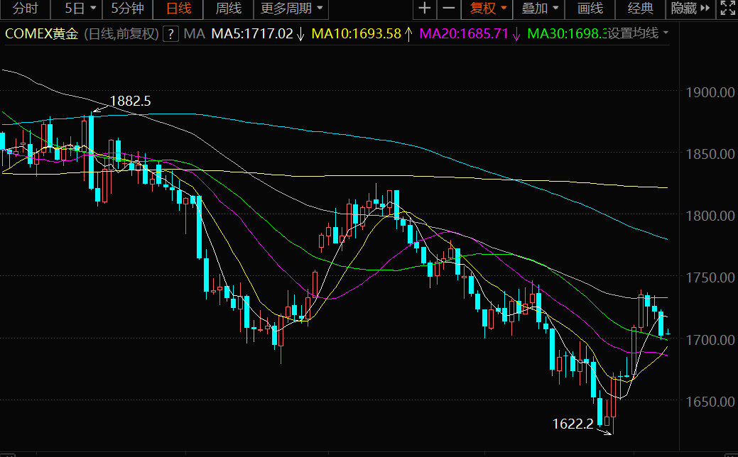 技术上,鉴于金价在颈线和55日均线附近受阻,可能需要形成一个右肩后才能启动中长线涨势,短线留意1700关口和9月21日高点1687.95附近支撑,在跌破1687.95前,后市整体偏向多头,若跌破1687.95支撑,则需要提防金价重回跌势的可能性,进一步支撑参考1680关口,10日均线和21日均线支撑也都在该位置附近,也需要重点关注。