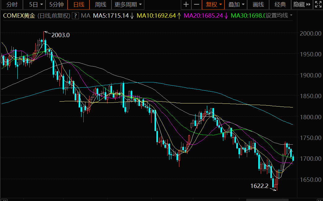 技术面:鉴于MACD金叉信号仍在,在失守10日均线前,金价仍有延续“头肩底”底部形态的可能性,初步阻力在1700关口附近,5日均线阻力在1707.11附近,若能收复该位置,则削弱短线看空信号;强阻力在55日均线1722.71附近,若强势顶破该阻力,则增加中线看涨信号。
