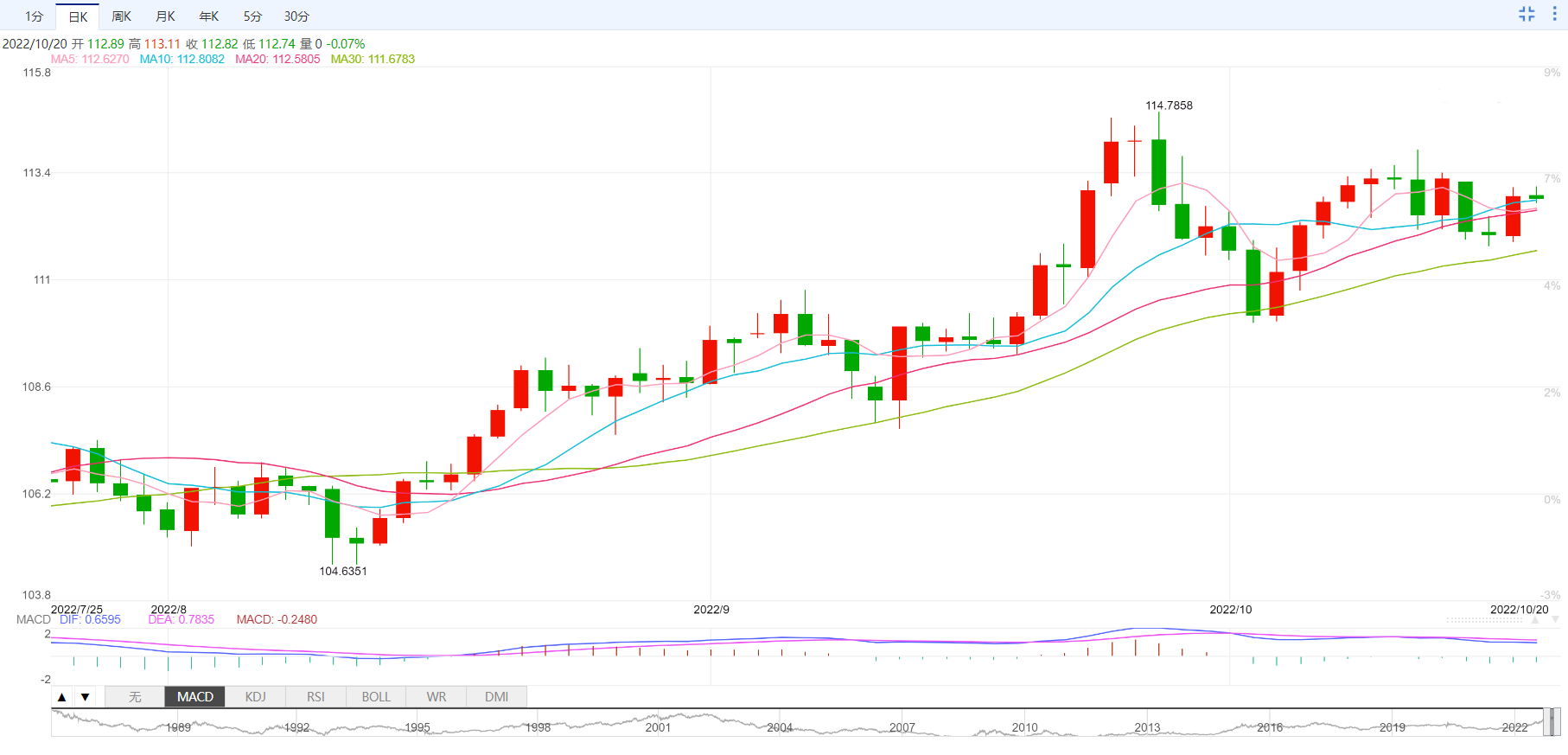 技术面:美元指数在112.26点上涨了0.24%,下一个障碍是113.88(10月13日的月最高价),然后是114.76(2022年9月28日的最高价),然后是115.32(2002年5月的最高价)。