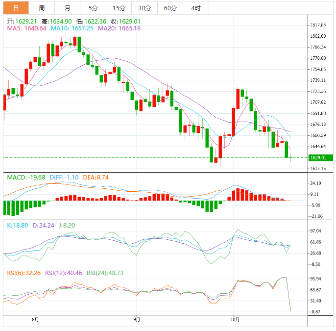 技术面:最新跌势打开了金价测试2022年低点1615美元的大门,之后金价将试探1600美元关口。14天相对强弱指标潜伏在中线下方,维持下行潜力不变。任何反弹尝试看考验此前的趋势线支撑,目前在1647美元转为阻力位。下一个上涨目标似乎位于间歇性低点1660美元。之后多头将升破温和看跌的21日MA均线1666美元。
