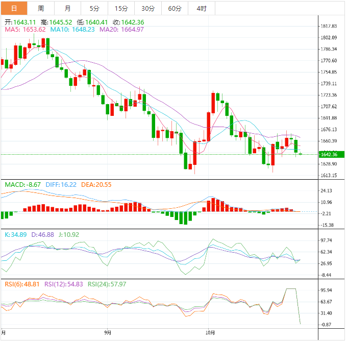 技术面:金价在上周二创下的1,638.15美元的周低位附近徘徊。金价目前分别位于1,644.54美元和1,655.63美元的20期和50期指数移动平均线(EMAs)下方,这增加了下行阻力。与此同时,相对强度指数(RSI)(14)在40.00附近面临障碍,这表明下行势头仍在继续。