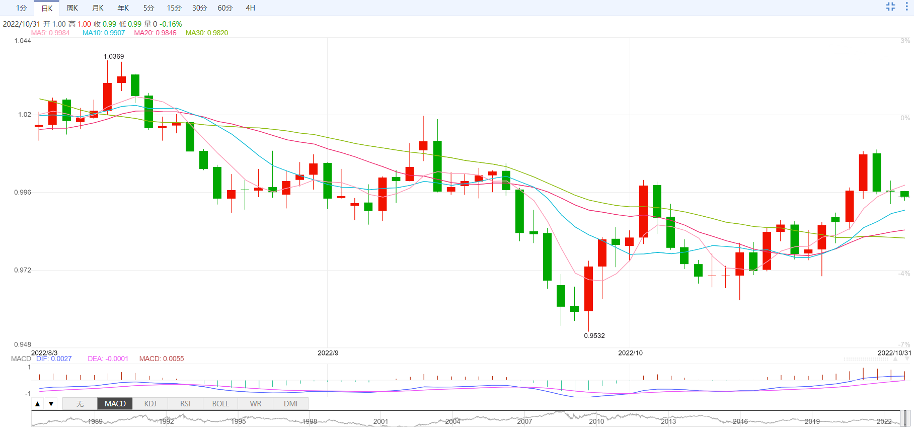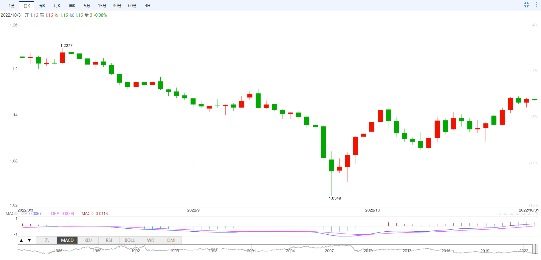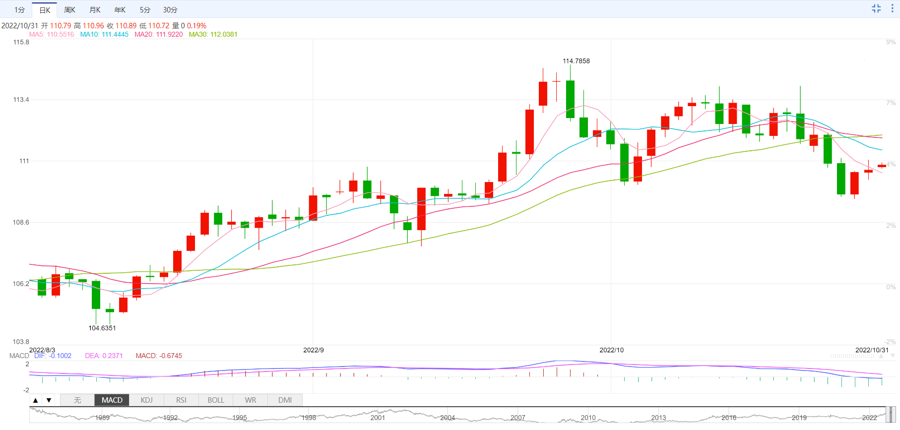 美元指数:截止发稿,美元指数小幅反弹,现报110.88,涨幅0.18%。欧市盘前,接近110.80。在此过程中,美元兑六种主要货币的指标受益于市场在美国关键数据/事件之前对风险安全的追逐,以及地缘政治担忧引发的担忧。展望未来,周三的联邦公开市场委员会(FOMC)会议将对美元指数至关重要,因交易商在本周会议利率预期为75个基点的情况下寻求美联储的下一步举措。同样重要的是周五将公布的美国10月份就业报告。