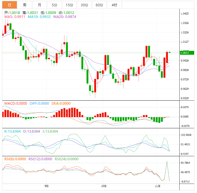 周二早盘,美元指数微跌,目前交投于110.28附近。因为市场获利了结,周一美元指数连续第二个交易日下跌,最后收跌0.54%,报110.19。欧元一度升至1.0033,为10月27日以来最高,最后收涨1.14%,报1.00。周一英镑兑美元收涨1.21%,报1.15。欧元和英镑兑避险美元周一均上涨,受助于市场呈现冒险意愿,同时投资者消化积极的欧元区数据,并希望从美元走强中获利了结。