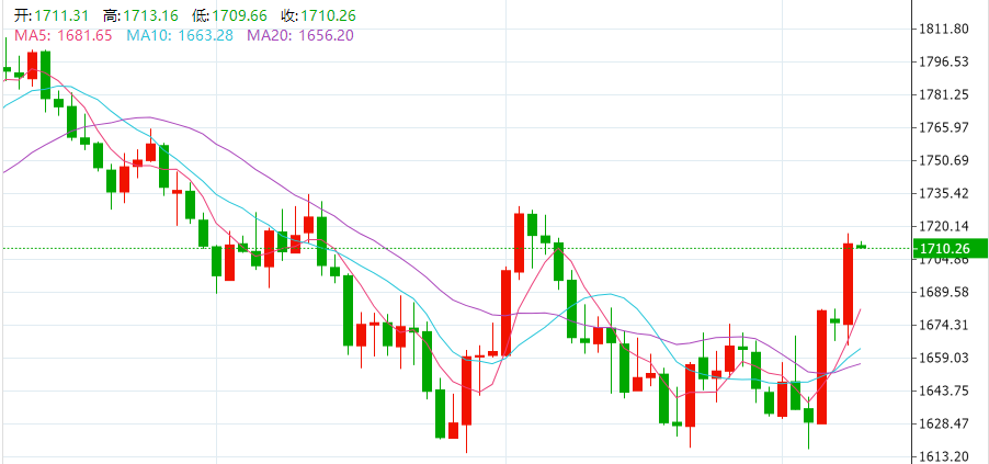周二(11月8日),现货黄金在美盘突然大幅走高突破1710关口,一度较日内低点拉升逾52美元,接连升破1680至1710美元的四道整数关口,最终收涨2.22%,报1712.58美元/盎司。现货白银日内一度大涨4%,突破21.60美元/盎司,最终收涨2.68%,报21.35美元/盎司。