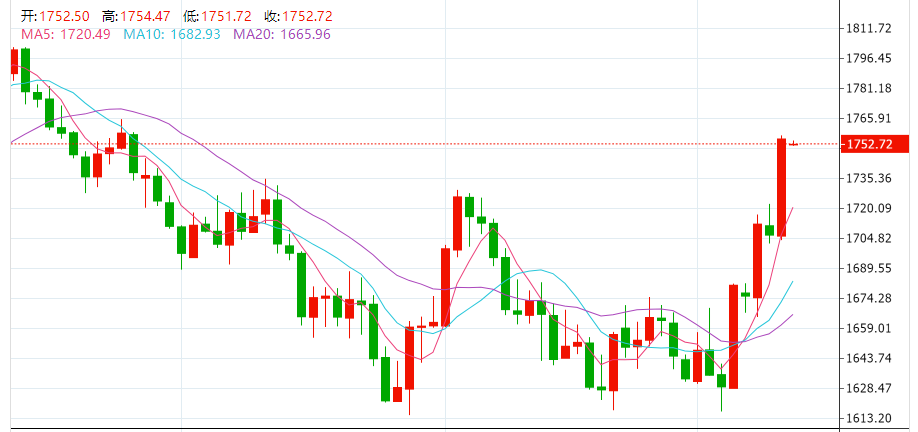 周三(11月9日),现货金、银暴涨。现货黄金暴涨2.86%,报1755.72美元/盎司;现货白银大涨2.97%,报21.68美元/盎司。