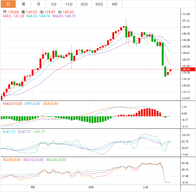 货币方面,欧元兑美元周一下跌0.27%,收报1.0325美元,上周五曾升至三个月高点1.0368美元。英镑兑美元周一收跌0.65%,收报1.1753;英国财政大臣亨特(Jeremy Hunt)周四将发布秋季声明,预计他将提出加税和削减开支。此前两个交易日汇价上涨了4%,上周五并触及8月底以来的最高水平1.1854。澳元兑美元收跌0.09%,至0.6699;纽元兑美元收跌0.36%,收报0.6093;美元兑加元周一收涨0.47%,收报1.3312;美元兑日元周一收涨0.8%,收报139.87,周二盘初延续涨势,目前上涨0.34%,交投于140.37附近。