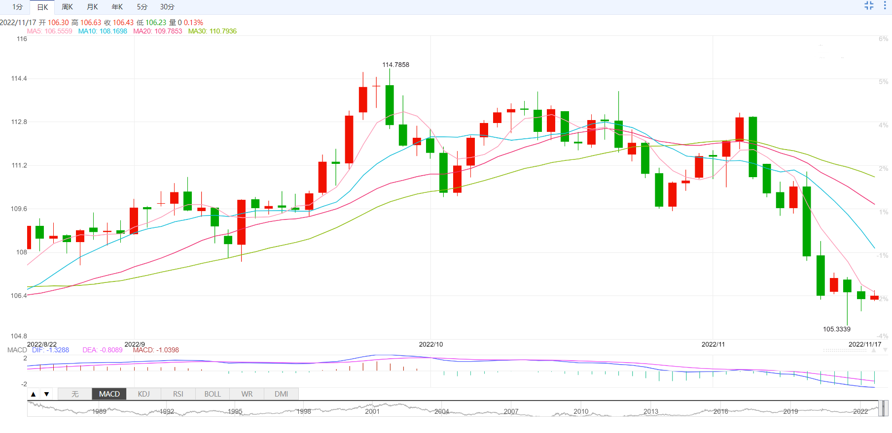 美元指数:截止发稿,美元指数上涨至106.41,涨幅0.11%。欧市盘中,美元指数在106.30附近来回波动。如果美元指数跌破104.60,则6月底和5月分别接近103.40和101.30的低点将引起市场的注意。