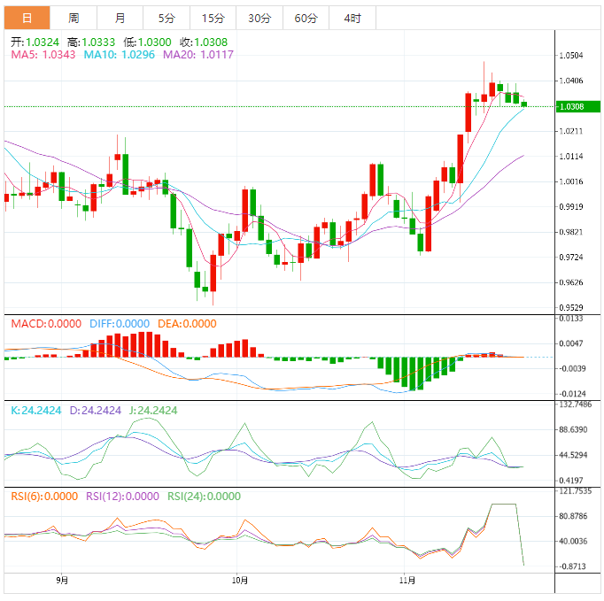 周一盘中,美元指数窄幅震荡,目前交投于107.12附近,本周主要关注新西兰联储利率决议和欧美国家11月份PMI数据,另外,本周将迎来美国感恩节,多数交易员可能提前休假,整体交投可能会受到限制。