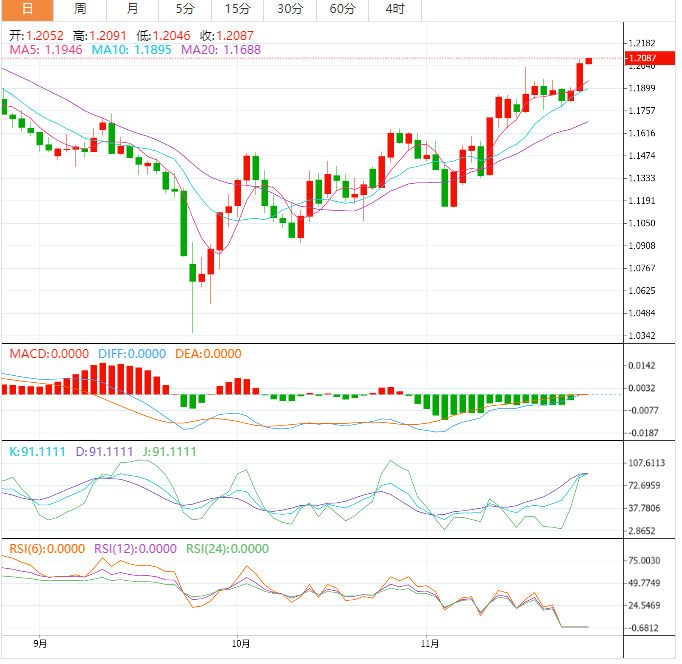 欧元兑美元周三大涨0.9%,收报1.0395,周四亚市早盘小幅冲高,一度创逾一周新高至1.0419,11月15日触及近五个月高点阻力在1.0479附近。英镑周三大幅走高,兑美元连续第二天上涨,此前英国经济活动初步数据好于预期,尽管仍显示经济正在萎缩。英镑收盘报1.2054,涨幅约1.45%,盘中最高触及1.2080,为8月19日以来新高。纽元兑美元周三大涨1.51%,收报0.6245,周四亚市早盘小幅冲高,一度创近三个月新高至0.6253。周三新西兰联储以创纪录幅度加息,尽管警告经济可能会在衰退中度过一整年。