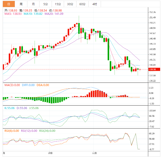 美元守住了200日均线的关键位置支撑,也是近三个月低点支撑所在,并在该附近展开反弹,留下了较长的下影线,增加了短线见底信号,后市美元有望转向多头。美元兑日元下跌0.18%,至138.92。欧元下跌0.44%,至1.0339美元,盘中早些时候一度涨至1.0496,为近五个月新高。澳元兑美元周一大跌1.42%至0.6651。澳元走势与亚洲大国经济增长密切相关。而且数据显示,由于物价上涨和利率上升似乎最终对支出产生了影响,澳洲10月零售销售遭遇2022年以来的首次下跌,这也使该货币受到了影响。