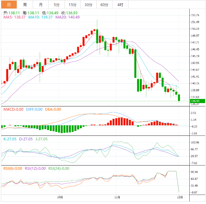 美元指数11月累计下跌5.01%,为2010年9月以来的最大月线跌幅。美元兑日元周三下跌了0.51%,至137.25日元,11月美元兑日元将下跌7.14%,为1998年12月以来最差月度表现。欧元兑美元周三上涨0.75%,至1.0405美元。11月累计上涨5.34%,为2010年9月以来最大月度涨幅。