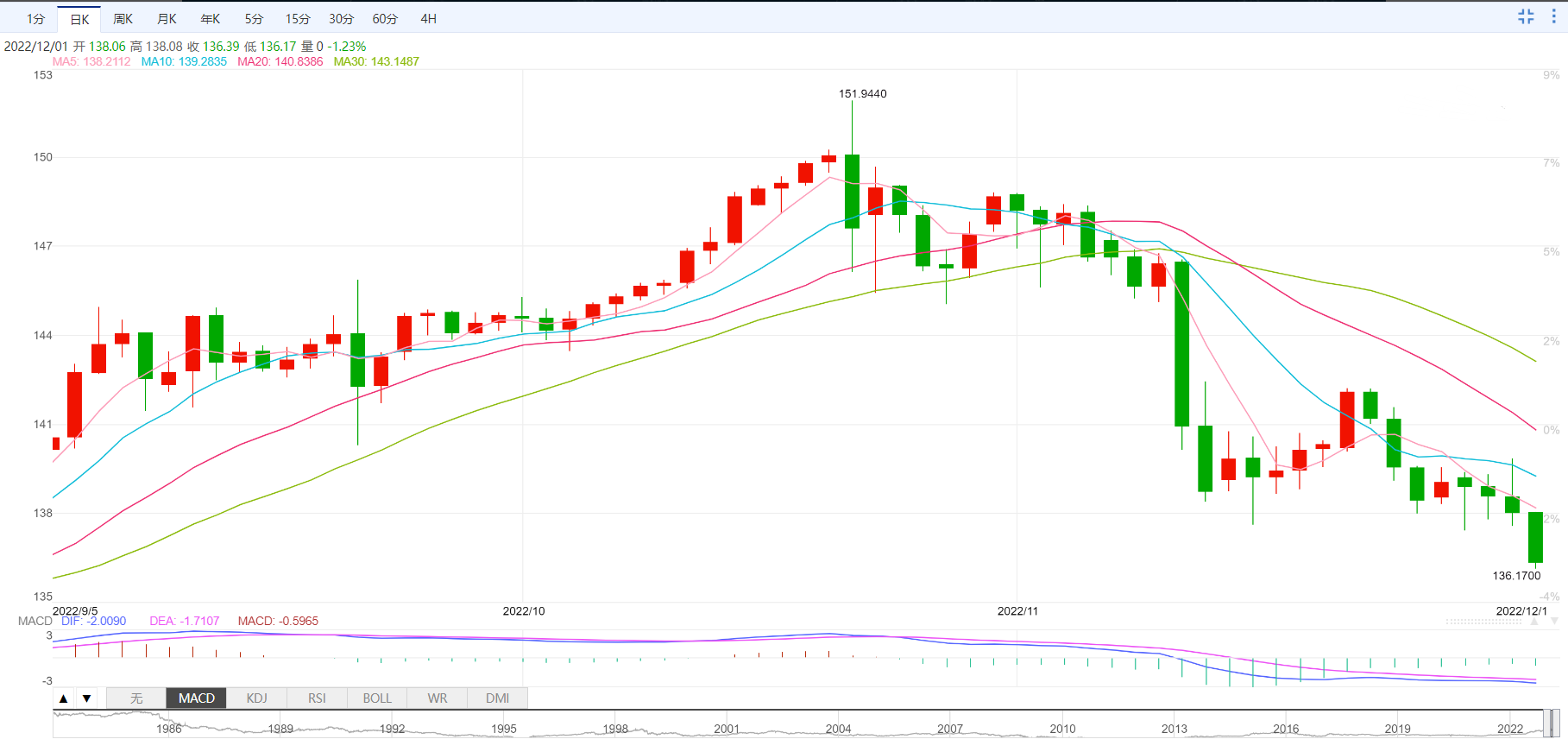 美元兑日元周四一度下跌1.18%,至136.49,为为8月26日以来的最低水平。美元兑日元汇率对美国长期收益率的变化极为敏感。
