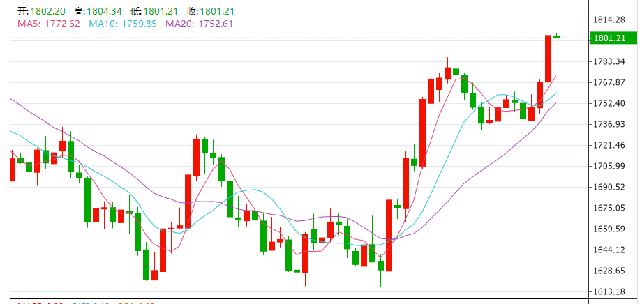 周四(12月1日),美元和美债收益率大幅走低提振金银大涨,现货黄金站上1800美元/盎司,为8月15日以来首次,较日低走高逾30美元,收涨1.97%,报1803.04美元/盎司。现货白银收涨2.51%,报22.75美元/盎司。