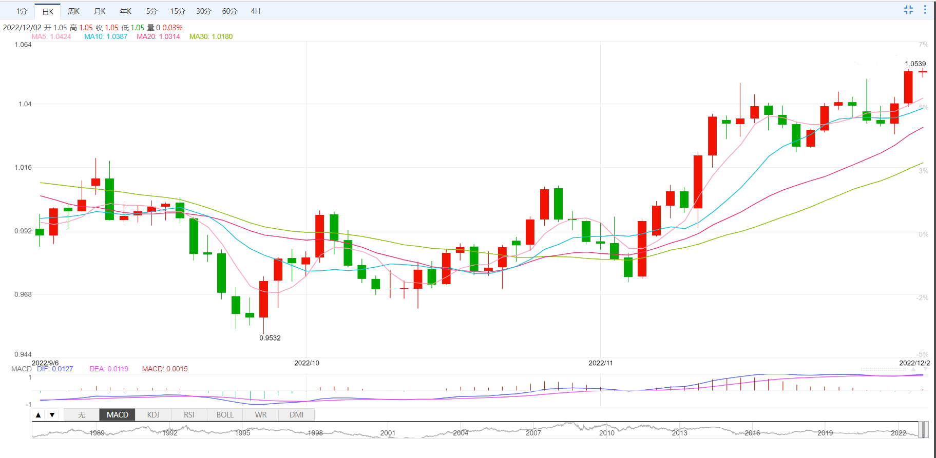 美元指数:截止发稿,美元指数走低,现报104.65,跌幅0.04%。欧市盘前,美元指数徘徊于6月底以来的最低水平,触及104.55。美元对六种主要货币的指标证明了市场在美国11月关键就业数据公布前的谨慎情绪是合理的。展望未来,总体非农就业人数(NFP)可能会放缓,从之前的26.1万增加到20万,而失业率可能保持在3.7%不变。值得注意的是,该月平均时薪数据的可能放缓也可能令美元指数承压。