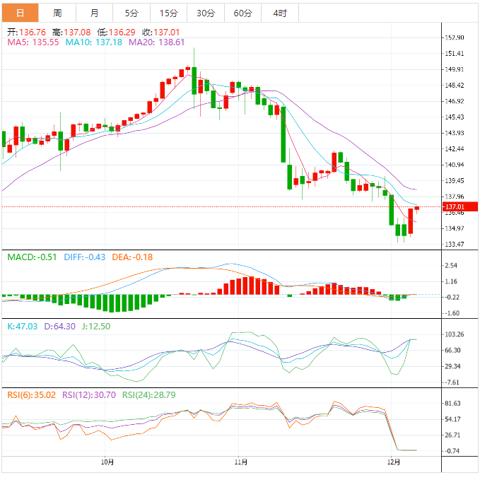 周二早盘,美元窄幅窄幅震荡,目前交投于105.26附近,守住了隔夜大部分涨幅。周一美元指数探底回升,早些时候一度创逾五个月新低至104.11,但在ISM服务业PMI数据公布后,美元指数扭跌为涨,因数据显示,美国服务业活动在11月意外回升,推动人们猜测美联储可能比最近预计的更进一步提高利率。投资者需要提防美元指数可能会迎来一波反弹行情。