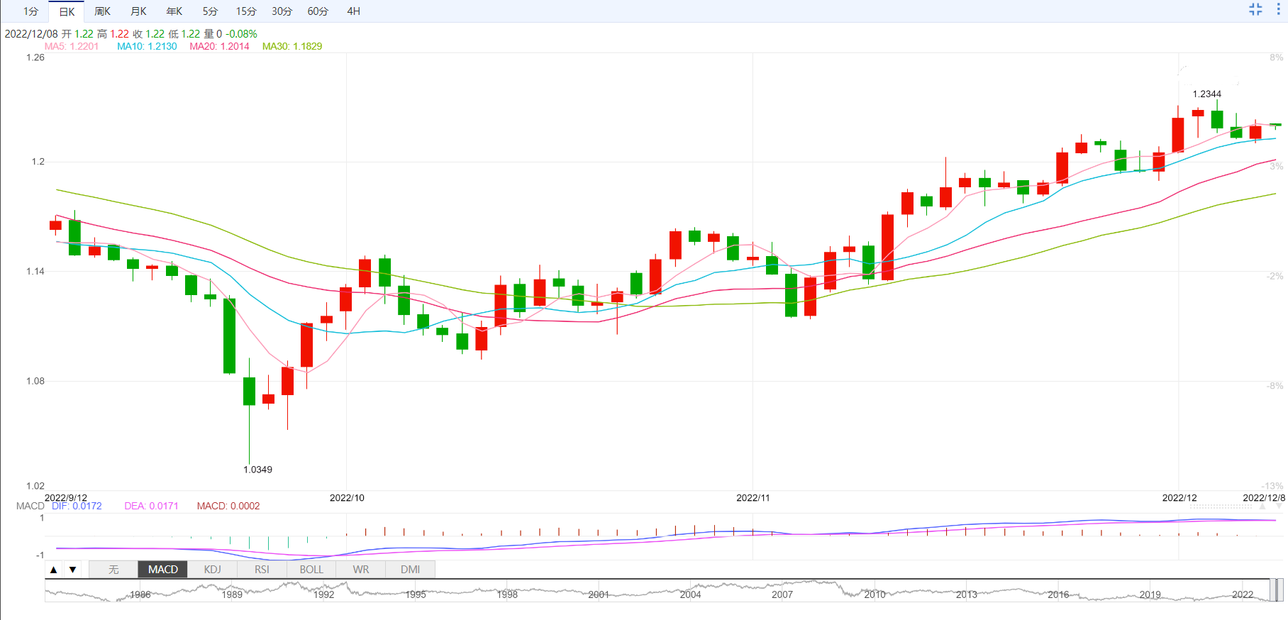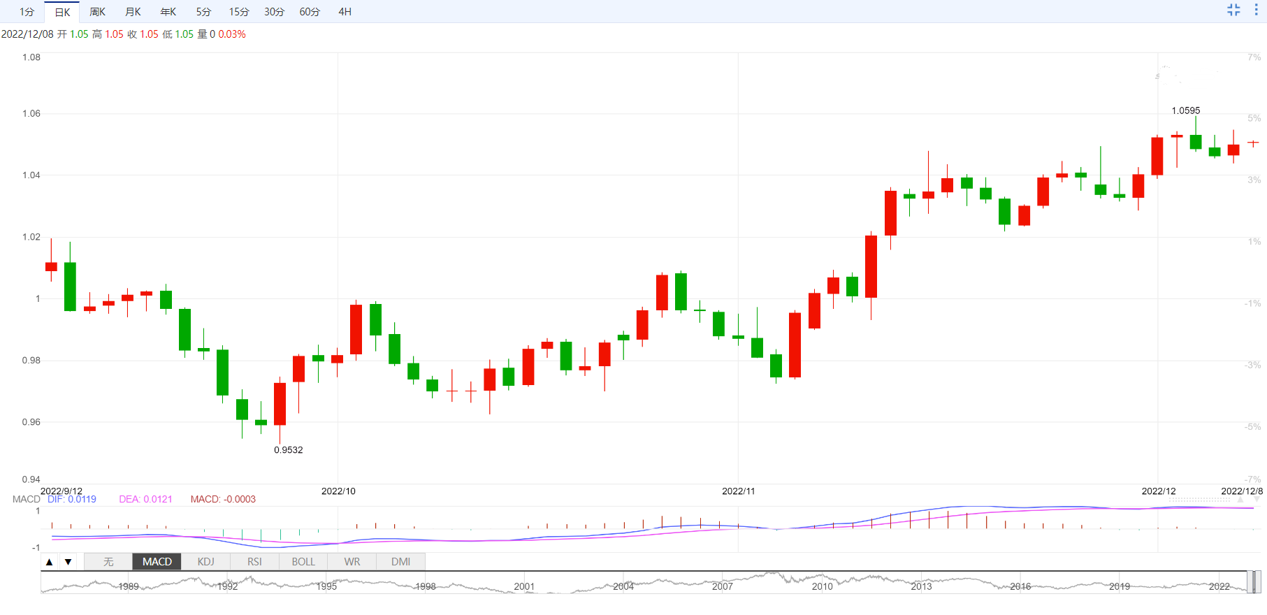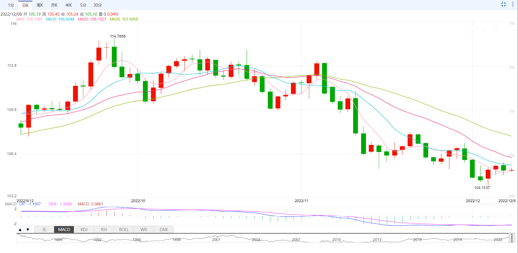 美元指数试图突破105.20的直接障碍时遇到了障碍。由于市场参与者的风险偏好显著改善,美元的上行似乎受到了限制。美国联邦储备委员会(Fed)在12月货币政策会议上提出上调利率峰值指引的不确定性,令投资者不以为然,纷纷将资金投向风险敏感资产。美元开始面临来自市场参与者的压力,因为投资者认为,联邦公开市场委员会(FOMC)在达到中性利率后,将从明年开始暂停紧缩政策。