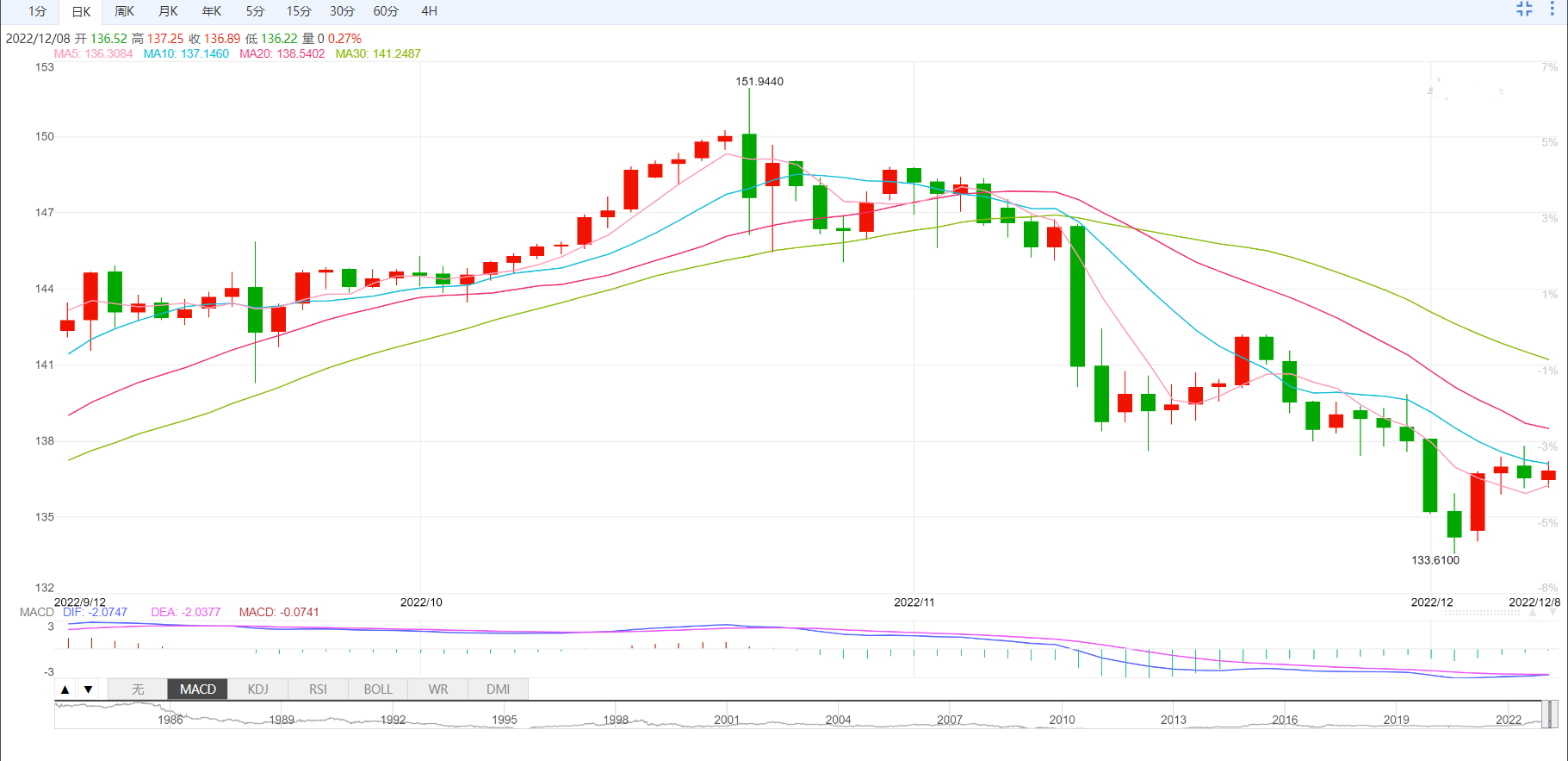 日本经济数据好于预期,美元/日元维持疲弱,交投于136.40附近。即便如此,美元/日元週三自一周高点回落后,仍总体处在震盪当中,原因可能是受开盘交易状况所致。日本第三季度国内生产总值终值好于最初预期,日本第三季度国内生产总值季率自-0.3%升至-0.2%,国内生产总值年率录得-0.8%,期值-1.1%,前值-1.2%。除了日本数据走强外,美国国债收益率下跌和美国数据走软也令美元/日元价格承压。
