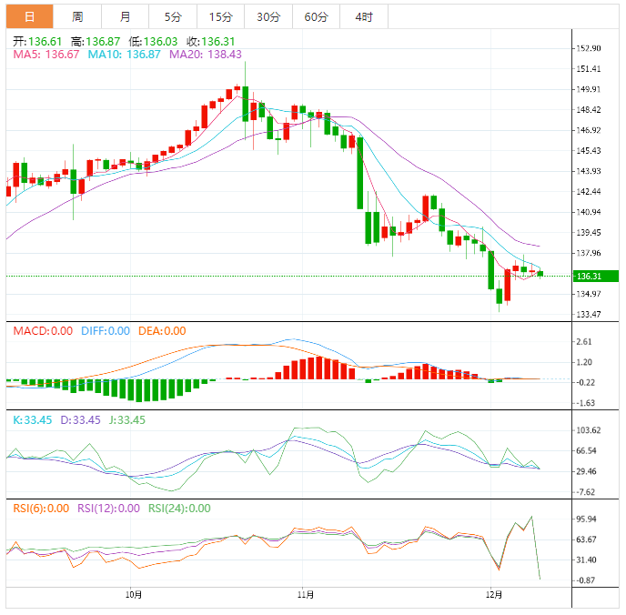 周五早盘,美元指数窄幅震荡,目前交投于104.65附近;周四美元指数下跌0.37%,失守5日均线,使得汇价跌至所有均线下方,均线接近空头排列,因对美联储将放缓加息步伐的预期持续打压美元,投资者需要提防美元的进一步下行风险;下周将迎来美国11月份通胀数据和美联储利率决议,市场交投相对谨慎,因投资者需要权衡美联储的政策前景和利率上升导致经济衰退的可能性。