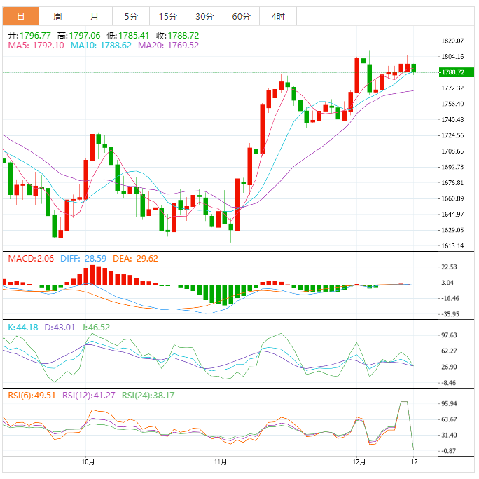 技术面:黄金价格正在下降到从11月23日低点1721.23美元开始绘制的向上倾斜的趋势线附近。黄金已跌破50周期指数移动平均线(EMA),收于1,791.60美元。然而,200-EMA在1,780.00美元附近仍在上涨,这增加了上行过滤器。