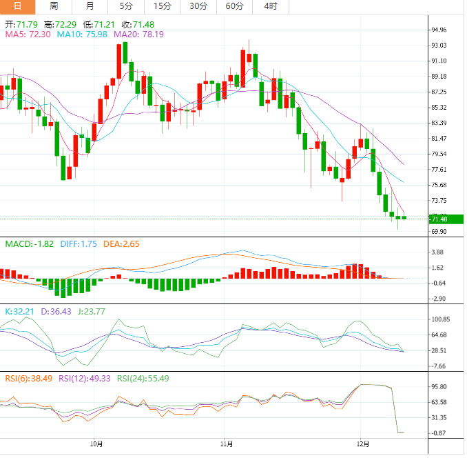 技术面:由于MACD的看跌信号不是特别强,KDJ的看跌信号有所减弱,盘面上已经严重超卖,预计70之上存在反弹的可能,需要提防油价探底回升或者低位震荡的可能性,而上方初步阻力在5日均线73.57附近。今日反弹高空为主,回踩低多为辅,上方短期关注74.3-74.5一线阻力,下方短期关注70.0-69.5一线支撑。
