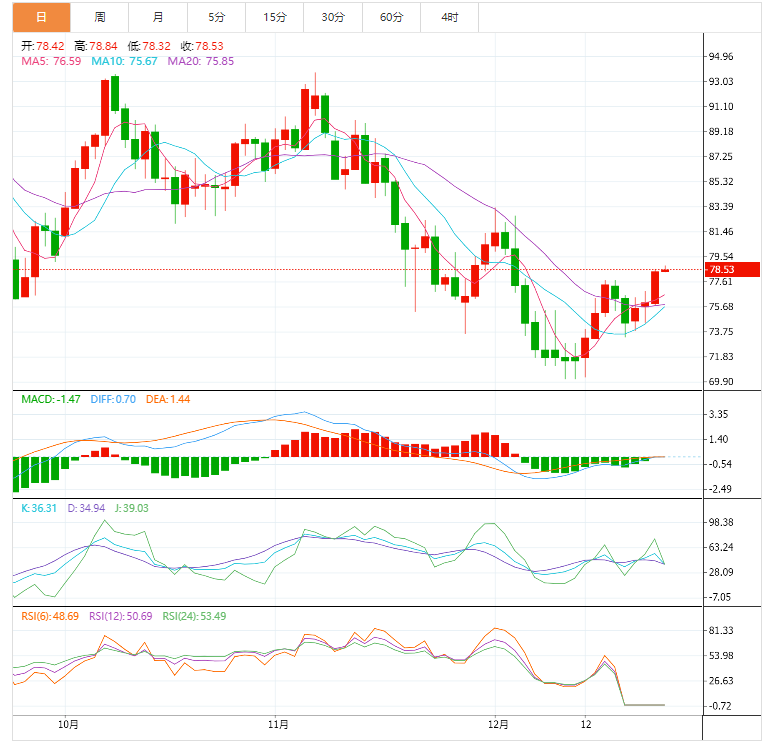 技术面:继突破看跌趋势阻力位之后,WTI油价沿著小型趋势线支撑位上涨,指向79.80美元。