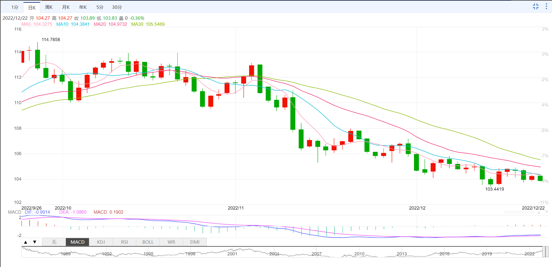 美元指数:截止发稿,美元指数下跌,现报103.86,跌幅0.38%。欧市盘前,美元指数从前一日的周低点反弹,因美国企业联合会(CB) 12月消费者信心指数跃升至八个月高点108.3,而市场预测为101.0,此前修正后的读数为101.40。然而,美国11月成屋销售环比409万,高于预期420万和前值443万,这让看涨美元的人士感到担忧。