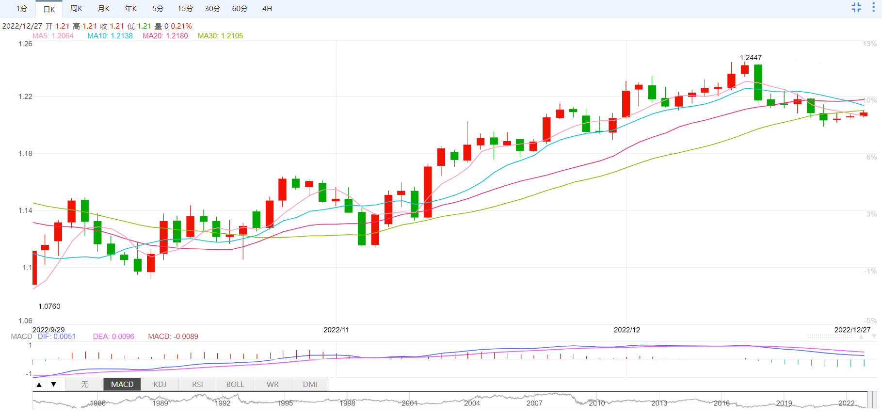 英镑/美元自1.2100附近的整数水平下跌后转为在1.2080附近横盘。英镑未能延续涨势突破1.2100后小幅调整。因此乐观的风险情绪令其看张倾向尚未消退。英镑尝试突破一小时图上的下降通道形态。该形态的上轨自12月20日高点1.2223开始,而下轨自12月20日低点1.2085开始。英镑的回应性买入行为推动英镑升破20和50EMA均线,它们分别委员1.2068和1.2072附近。