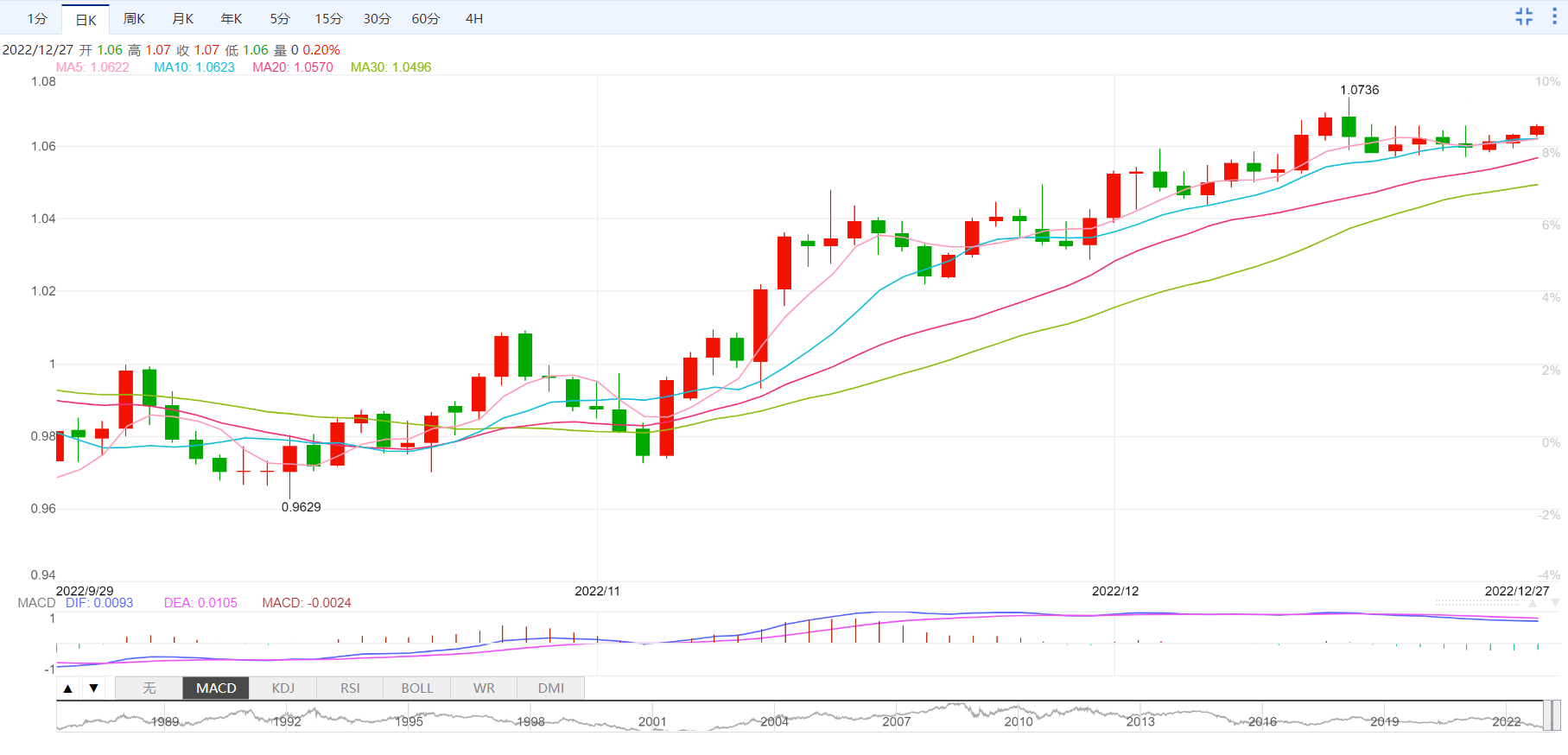 美元指数:截止发稿,美元指数下跌,现报103.90,跌幅0.25%。欧市盘前,美元指数整理盘中跌势,它已反弹脱离当日低点103.95。即便如此,反映美元兑六大主要货币价值的美元指数仍为连续第三日下跌。最重要的是,由于最近美国11月核心个人消费支出(PCE)价格指数和耐用消费品订单数据表现不佳,美联储(FED)的鹰派倾向减弱,这似乎让黄金买家充满希望。