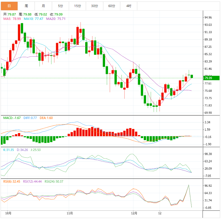 技术面:油价升破自11月7日高点92.36美元以来的下降趋势线后上涨。油价正致力于升破200EMA均线78.90美元,表明从长期看上涨趋势强劲。与此同时,14天相对强弱指标从看涨区间60.00-80.00跌入40.00-60.00的区间,表明上行势头减弱。
