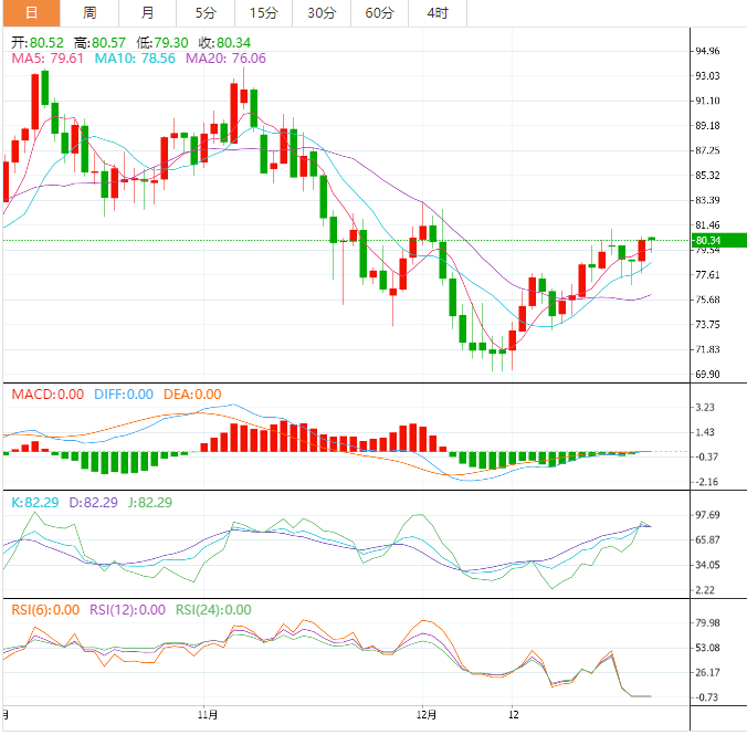 技术面:从布林带上看,三线呈现下降走平趋势,价格在破位布林带中轨后,目前整体停盘在布林带上轨82.2下方的位置,K线动能偏向强势,从技术指标上看,MACD和KDJ整体趋势都是偏向多头,所以从日线级别上看油价是偏向看多。