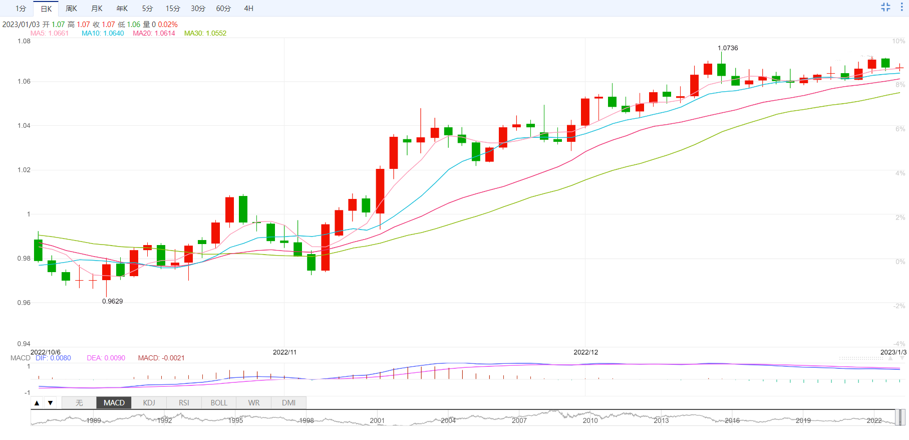 技术面:相对强弱指标(14)未能延续处在60.00-80.00的看涨范围,回落至40.00-60.00区间。上行方面,欧元/美元需要突破12月15日高点1.0736,这将提振欧元/美元上涨至6月9日高点1.0774,随后是阻力位整数关1.0800。