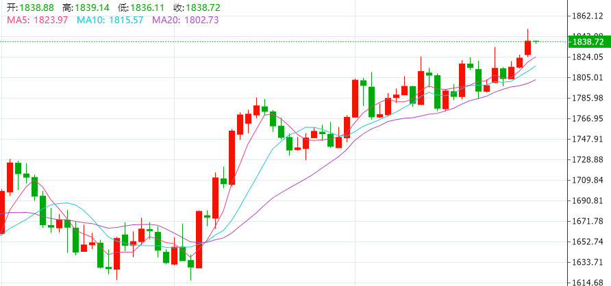 周二(1月3日)美债收益率下行提振金价,现货黄金延续反弹,一度逼近1850美元关口,刷新去年6月中旬以来的逾半年高位,收涨0.89%,报1838.98美元/盎司;现货白银高位回落,收涨0.29%,报23.99美元/盎司。