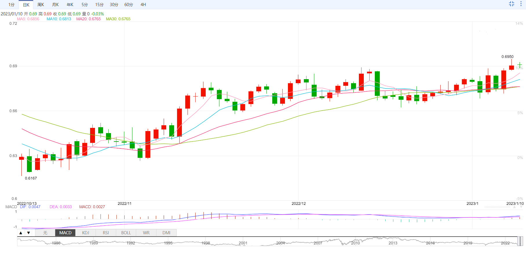中国迅速重新开放也促使资金撤出避险美元,转向高风险资产。对风险敏感的澳元上一交易日飙升至0.6950美元的四个多月高点,目前交投于0.6901附近。