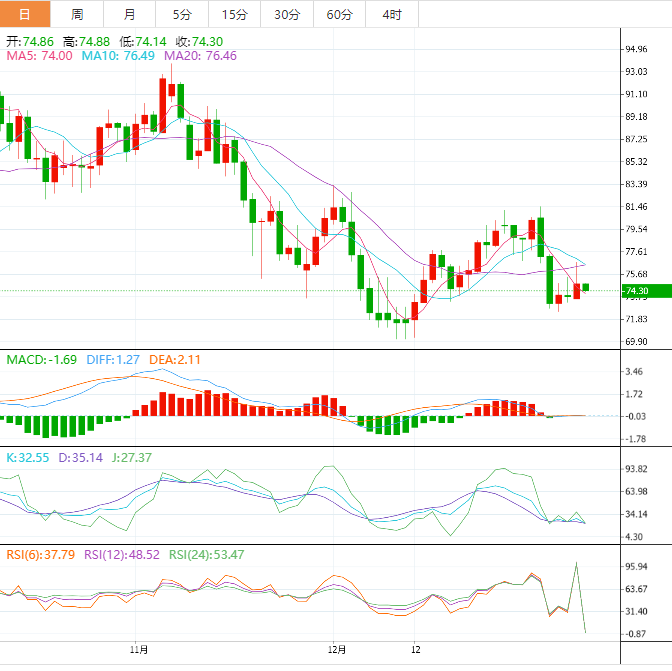 技术面:WTI油价前日未突破水平阻力76.75-95美元,且MACD信号看跌,空头维持希望。同样构成短期支撑的还有上週四以来的上行倾向支撑截至发稿时处在74.25美元附近。WTI油价仍疲弱,跌破74.25美元,74.00美元关口可能是多头的最后防线,然后是低位72.60美元附近。