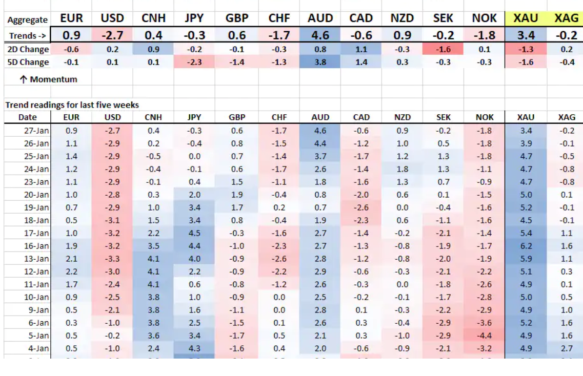 昨日,美国国债收益率小幅上扬,原因是上周初请失业金人数再次下降(至18.6万,为去年4月以来最低),同时美国第四季度GDP预期略强于预期。这有助于防止美元进一步下跌,但感觉美元交易者认为没有必要在这里交易,因为下周将出现一系列重要的美国宏观风险,包括周三的FOMC会议,同一天是ISM制造业调查,然后是周五的就业和收益数据以及ISM服务业(回想一下12月ISM服务业调查的奇怪大跌幅)。