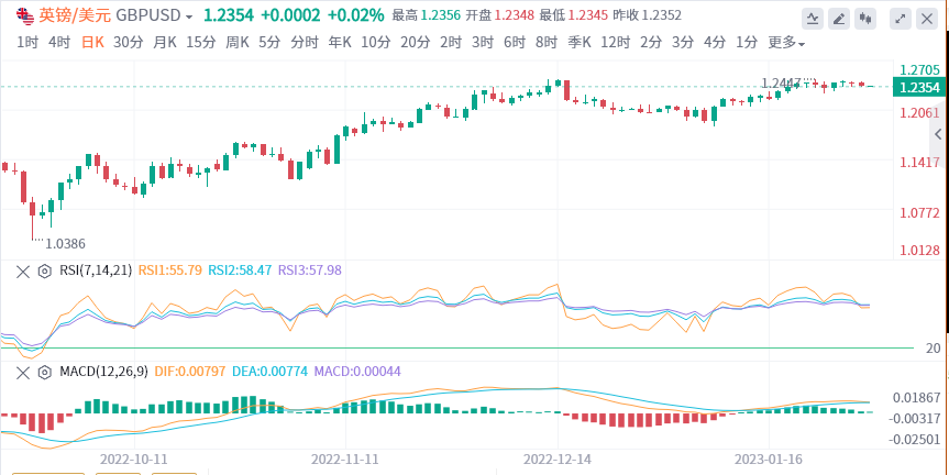英镑:截止发稿,英镑/美元徘徊于1.2354附近,昨日英镑/美元收低,收报1.2349,跌幅0.31%。预计英国央行和欧洲央行周四开会后都将宣布加息50个基点。分析师估计,2月公布决议后,英国央行将暂停加息。技术面上,汇价上行的初步阻力位于1.2396,进一步阻力位于1.2447,关键阻力位于1.2477;汇价下行的初步支撑位于1.2315,进一步支撑位于1.2285,更关键支撑位于1.2234。