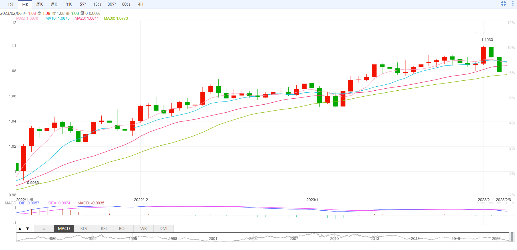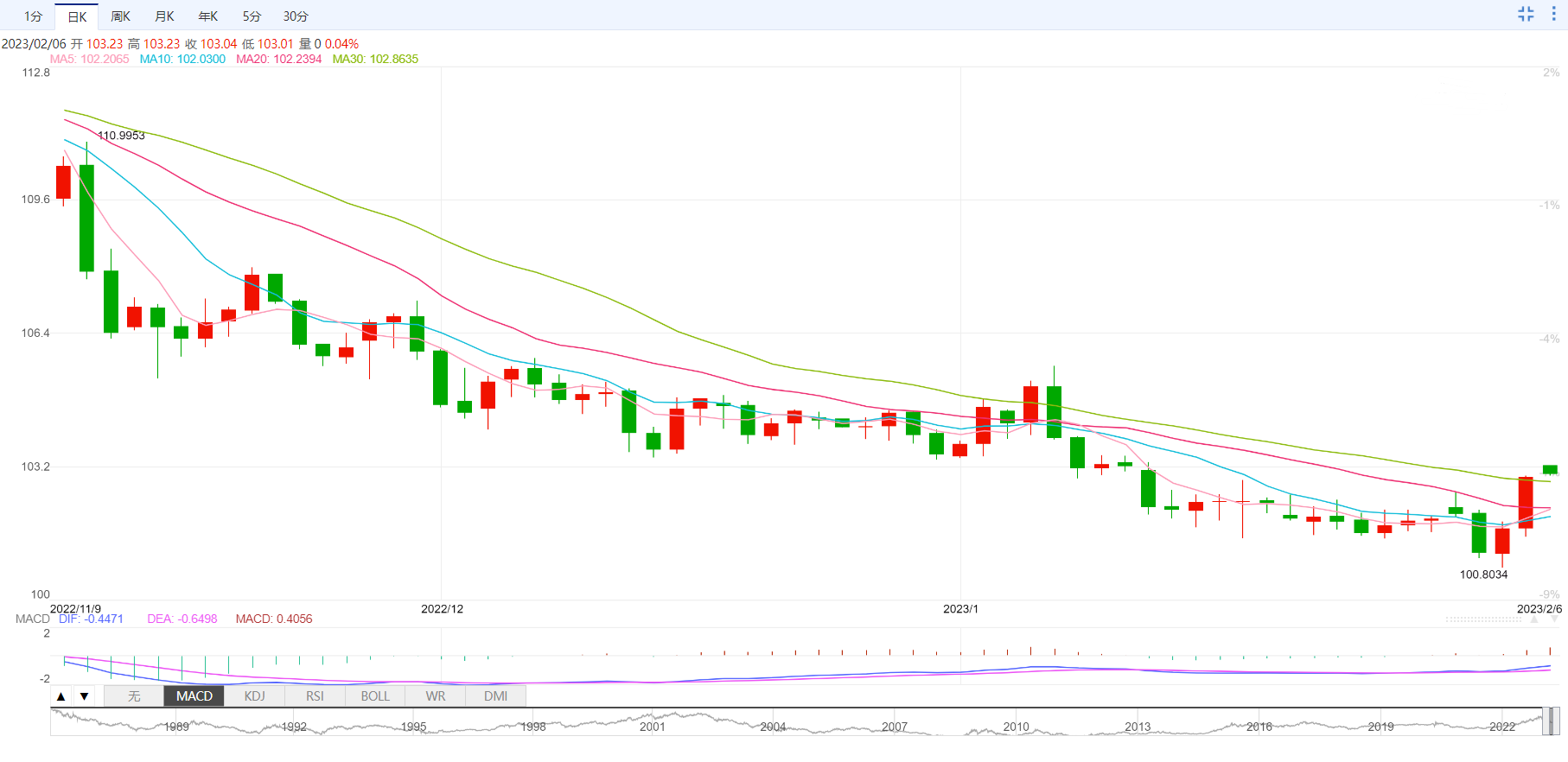 美元指数:截止发稿,美元指数上涨,现报103.12,涨幅0.11%。欧市盘前,美元指数在103.00上方保持防御性,多头等待更多线索,以延续从2022年4月以来的最低水平持续两天的复苏。美国ISM服务业PMI从49.2反弹至55.2,高于预期的50.4,也支撑了美国国债收益率和美元的反弹。尽管如此,基准的美国10年期国债收益率出现了自2022年9月底以来的最大涨幅,在动荡的一周结束时反弹至3.52%的水平。