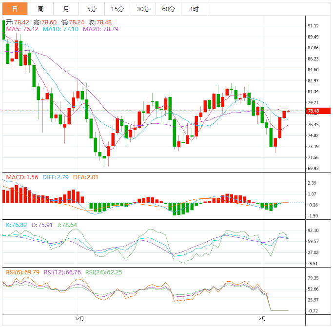技术面:WTI原油从75.00反弹到77.30。同样,布伦特原油从82.00上涨至84.00。如果上涨势头持续,WTI原油和布伦特原油可能分别涨向近期阻力位80.00和86.00。