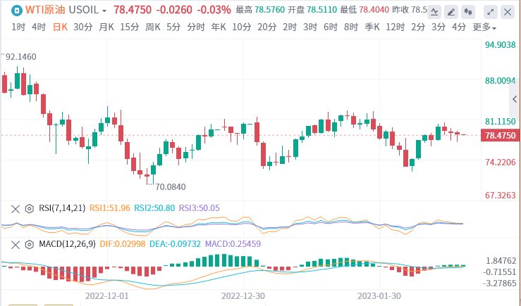 周四亚盘,原油交投于78.47附近。油价周三小跌,美元走强,且投资者担心利率上升将使经济放缓并打击燃料需求。跌幅有限,市场考虑到是数据调整导致美国原油库存大增,且国际能源署(IEA)上调全球石油需求增长预测。美国能源信息署(EIA)周三表示,在截至2月10日的一周里,原油库存猛增1630万桶,达到4.714亿桶,是2021年6月以来的最高水平。增幅比路透访查中分析师预测的120万桶大得多。但分析师们表示,EIA数据中异常大的原油供应调整促成了超大规模的库存增加。IEA提高了对2023年石油需求增长的预测,并表示,由于石油输出国组织(OPEC)和盟友组成的OPEC+产油国联盟产量受限,下半年可能会出现供应短缺。